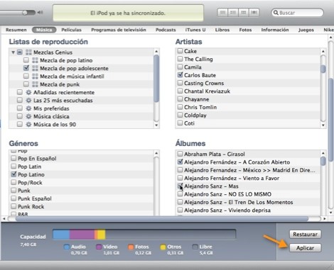 Para confirmar los cambios, presiona el botón “aplicar” y ya habrás pasado tu música desde tu computadora a tu iPhone 6 con éxito.